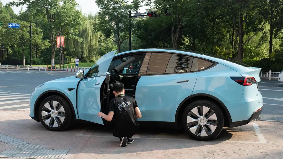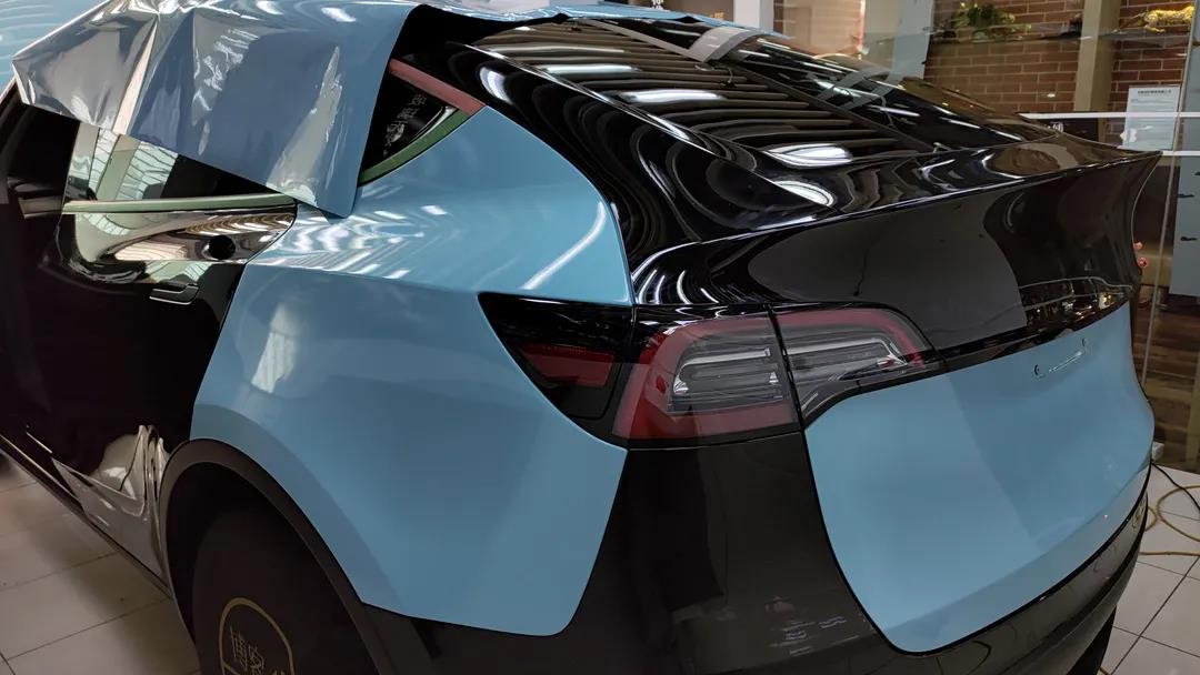 【施工車型】:特斯拉 model Y 【產品型號】:蒂芙尼藍 【施工項目】:整車改色
