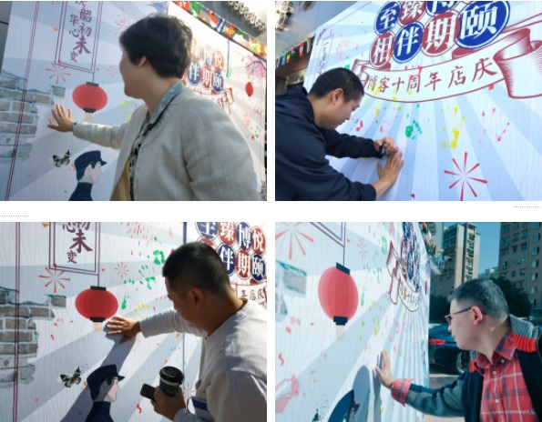今年店慶別出心裁,連簽名墻也增添了不一樣的色彩,留念方式由簽字改為生動有趣的按掌印了!從當(dāng)天早上開始營業(yè),新老朋友就絡(luò)繹不絕,紛紛前來祝賀,并在簽名墻上熱情按下自己的手掌印,表達自己對紫荊花店的支持和期望~